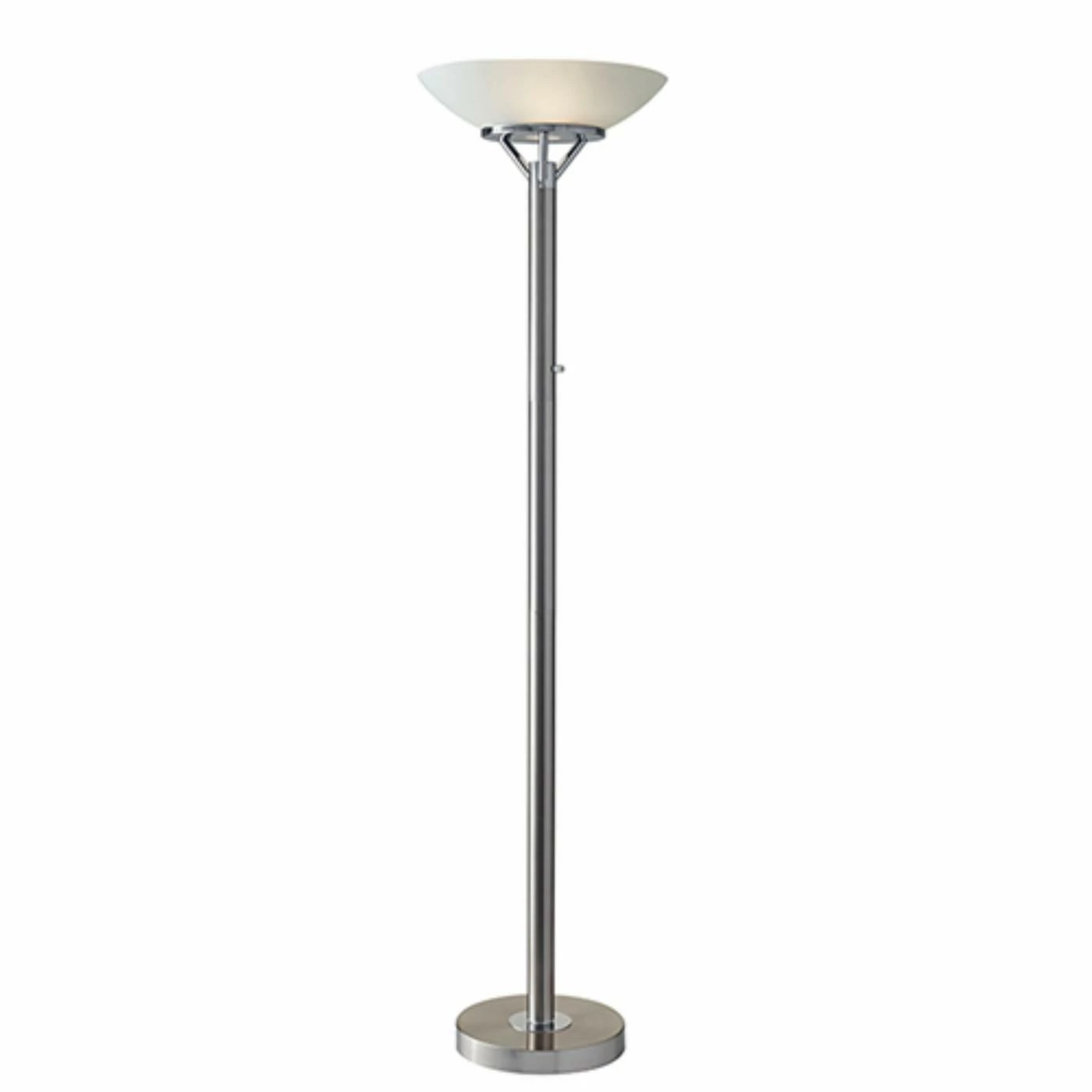 With its dramatic frosted glass torchiere shade and brushed steel finish, the Adesso Expo Torchiere Floor Lamp is perfect for your urban loft. This floor lamp requires one 3-way bulb, not included.