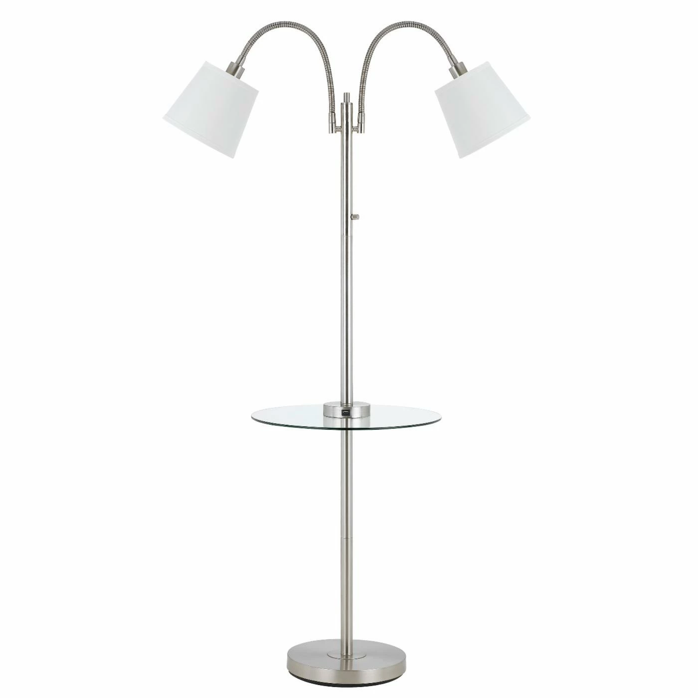 The Cal Lighting Gail Double Gooseneck Floor Lamp with Glass Table and Charging Ports is a great choice for your living room, foyer, or office. This floor lamp boasts a sleek metal construction with brushed steel finish and has white fabric shades. It’s enhanced with a circular glass table and two USB ports that your family and guests can use to charge their devices.