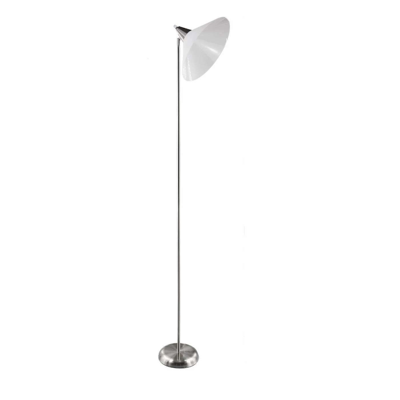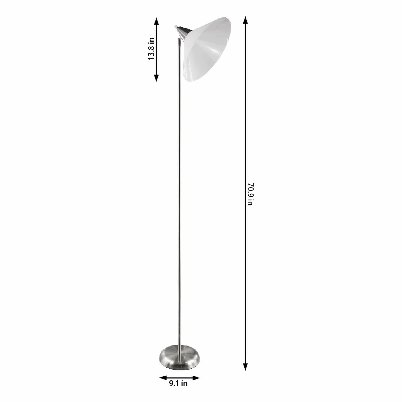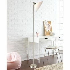 The Abble Swivel Torchiere Floor Lamp has a basic form that easily integrates into the home office, living room, dorm, or studio decor. This floor lamp has a white acrylic shade that adjusts vertically and horizontally so light can be directed where it is needed in the room. With an on/off rocket switch and satin nickel finish, this floor lamp adds contemporary style in any setting.