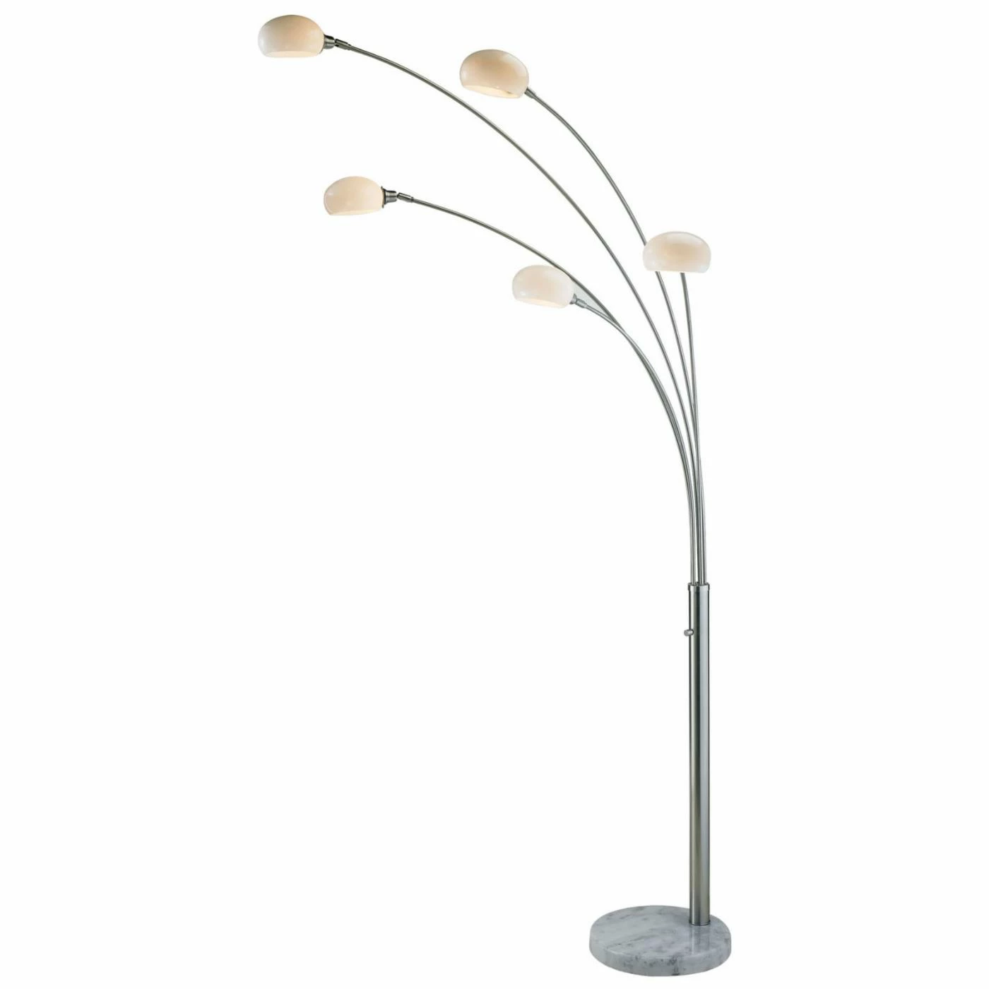 With a quirky style, the Adesso Luna Arc Floor Lamp will catch the eye of any guest. The five different lights with milky glass shades can be adjusted to fit your living space and style. With a full-range dimmer switch, this floor lamp can be adjusted to your preferred level of brightness. The five 40-watt candelabra bulbs are included with the floor lamp. With a chunky white marble base, the lamp stays firmly in place and provides a unique flair to your home.
