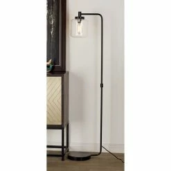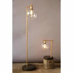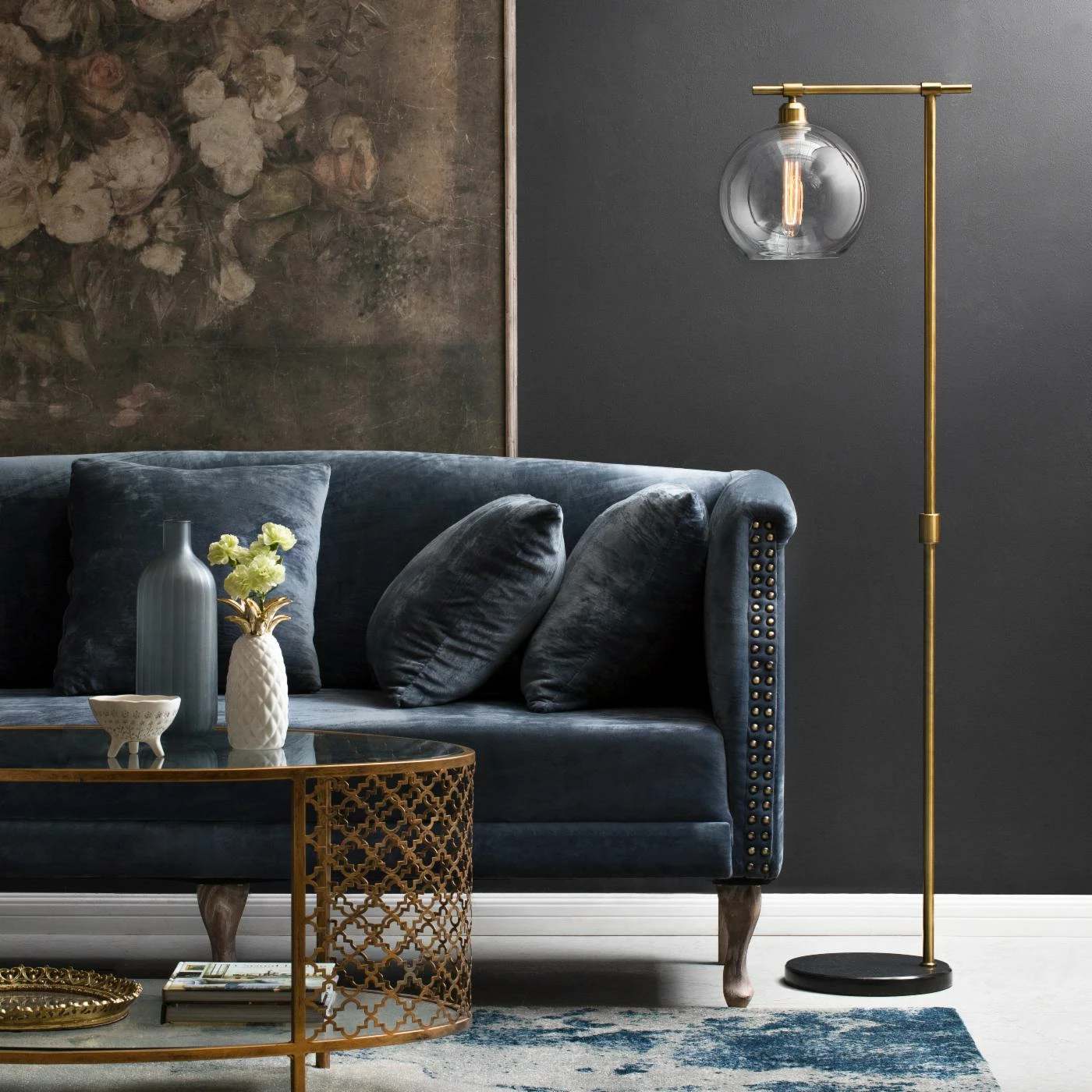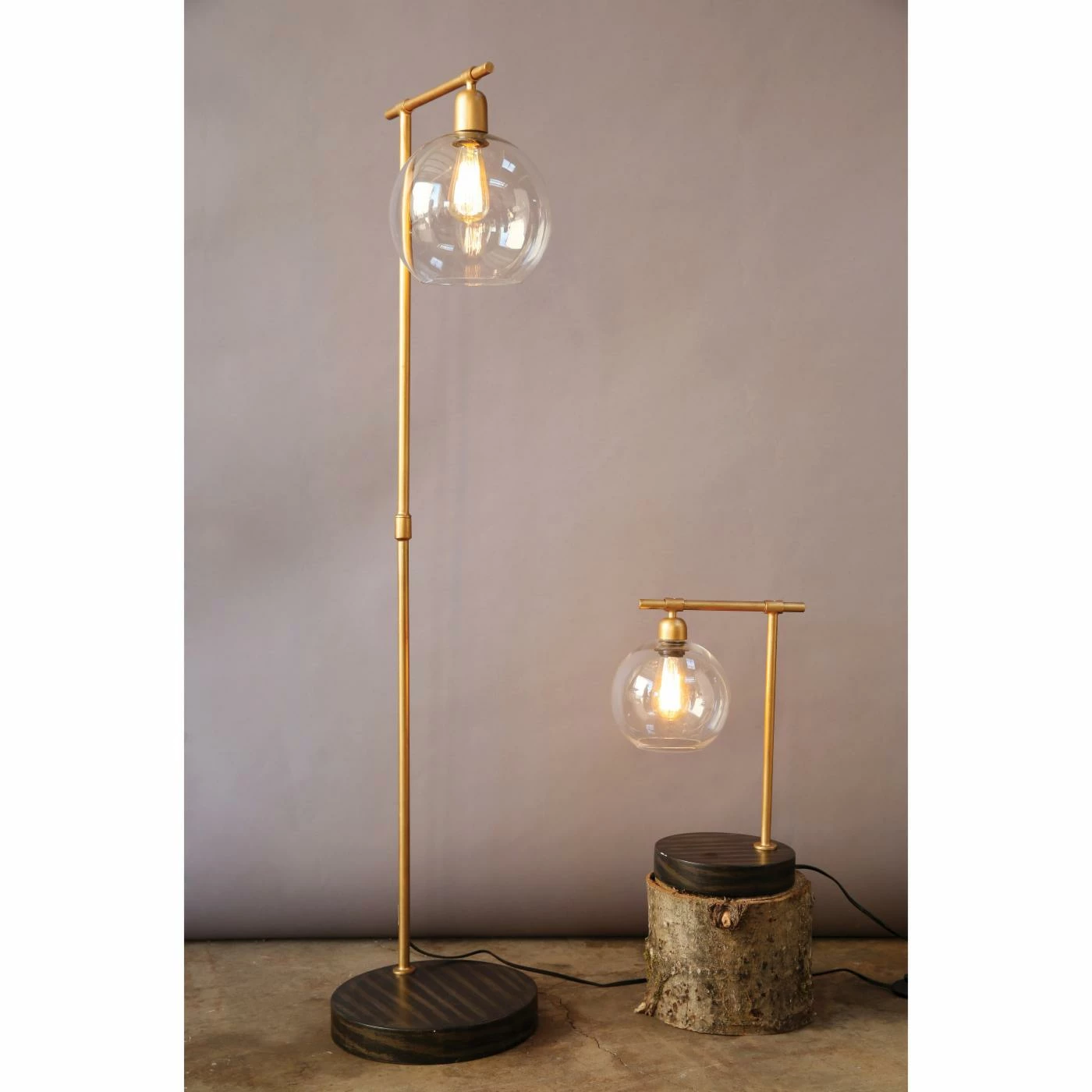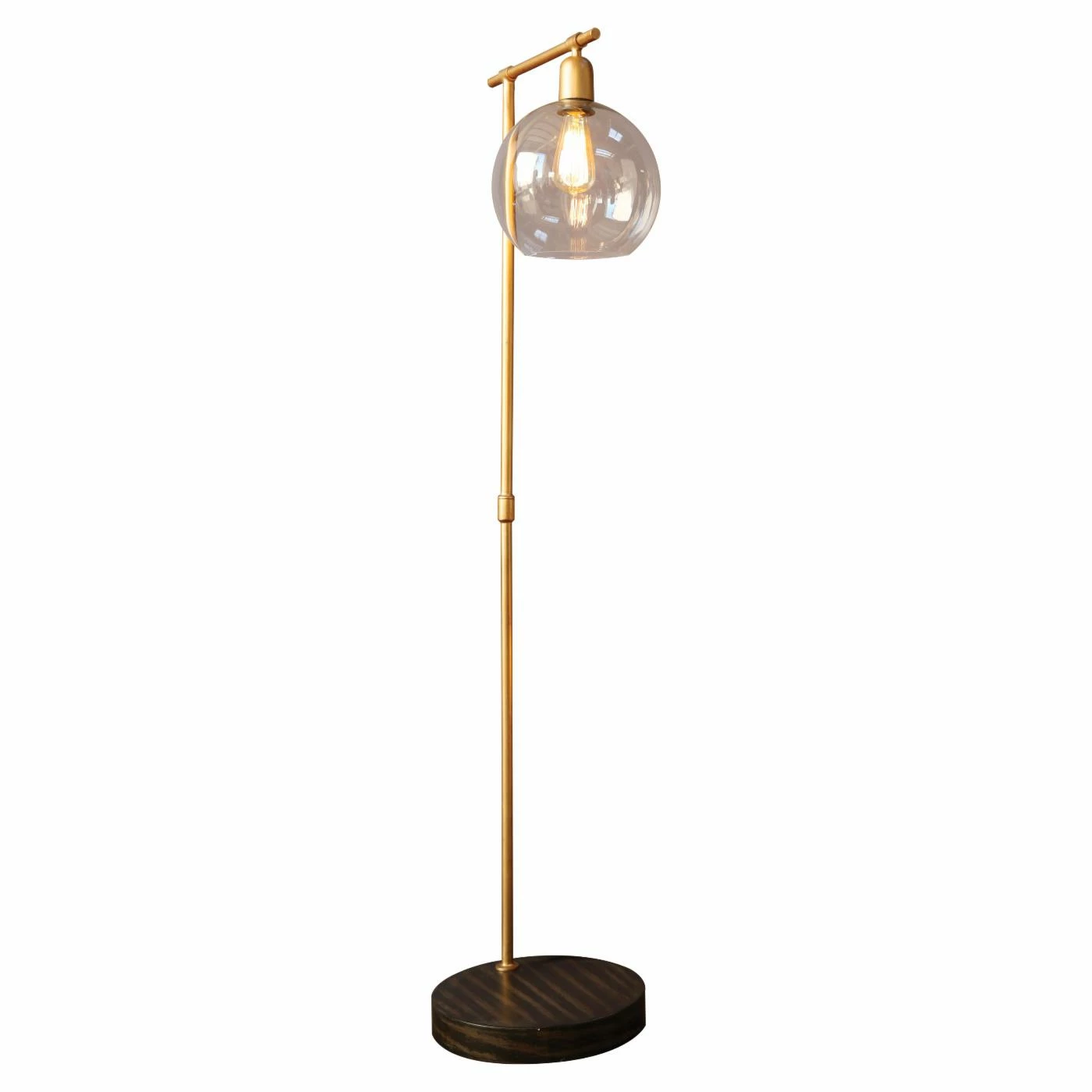 Spruce up your industrial style with the bright gold finish on the 3R Studios 59 in. Metal and Wood Floor Lamp with Glass Shade. This floor lamp has a metal and wood base with a gold finish. The iridescent glass globe shade will illuminate any room with a warm glow. Bulb is not included.