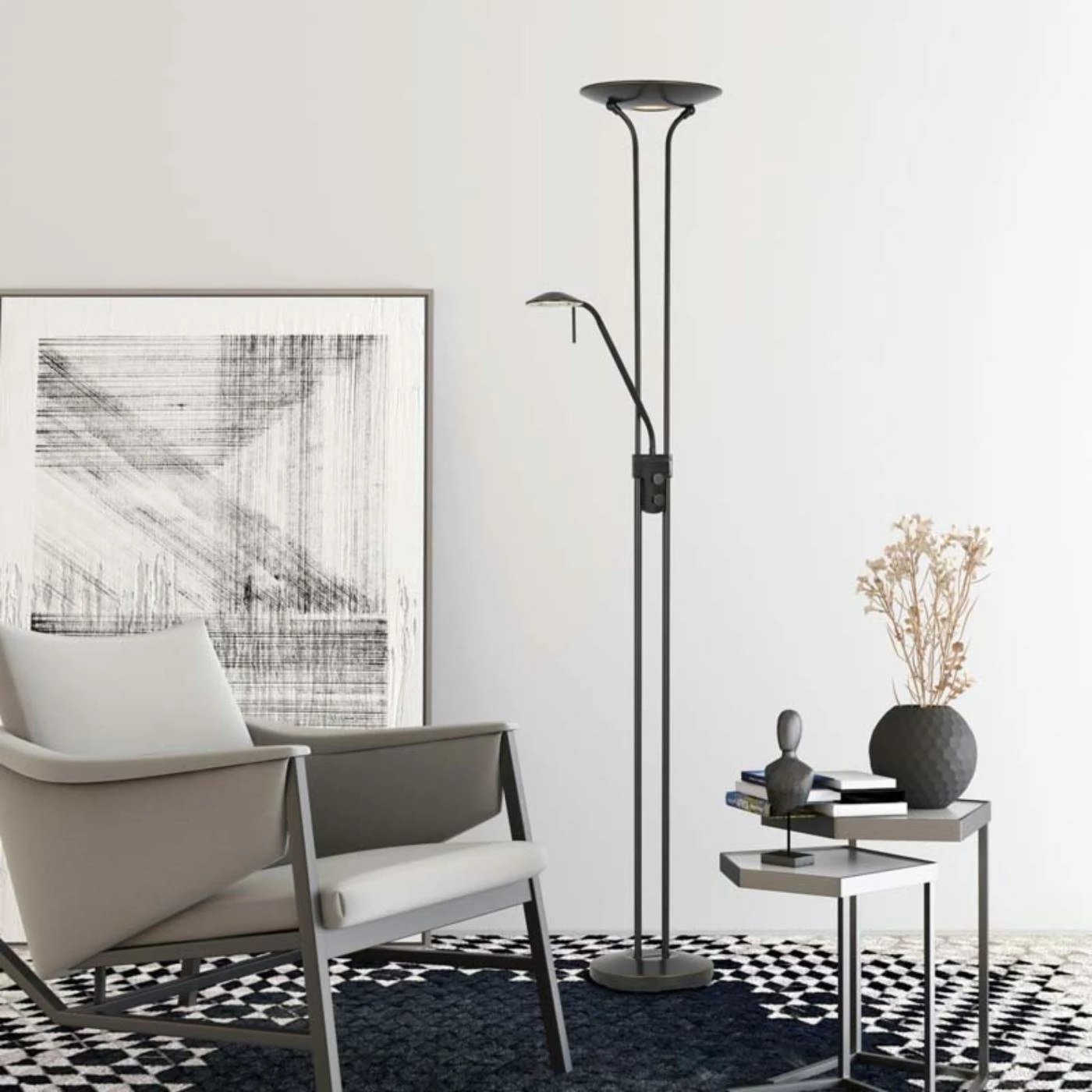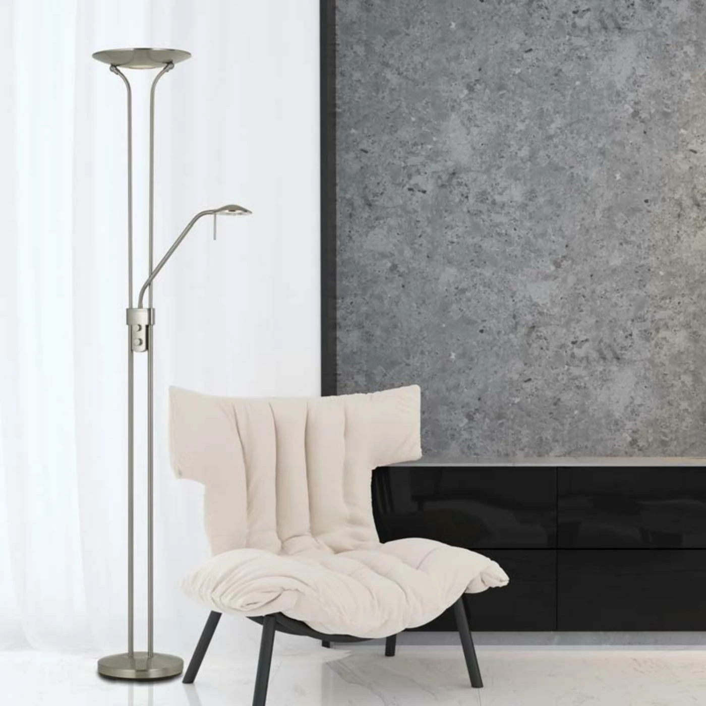 Featuring an ultra-modern design, the Cal Lighting Pavia LED Torchiere with Reading Light is the perfect marriage of style and functionality. Tall and slender, this floor light and accompanying torchiere features a dimmer switch and adjustable design. Select from the available finish options.