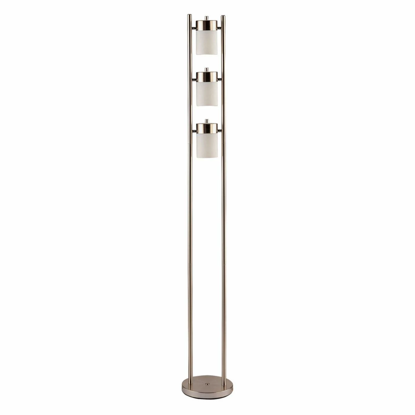 The Coaster Company of America 900733 Floor Lamp will brighten your living room dΓ©cor in more ways than one. This sleek floor lamp boasts a silver base and three frosted glass cylinder shades that swivel. It comes with the required bulbs.