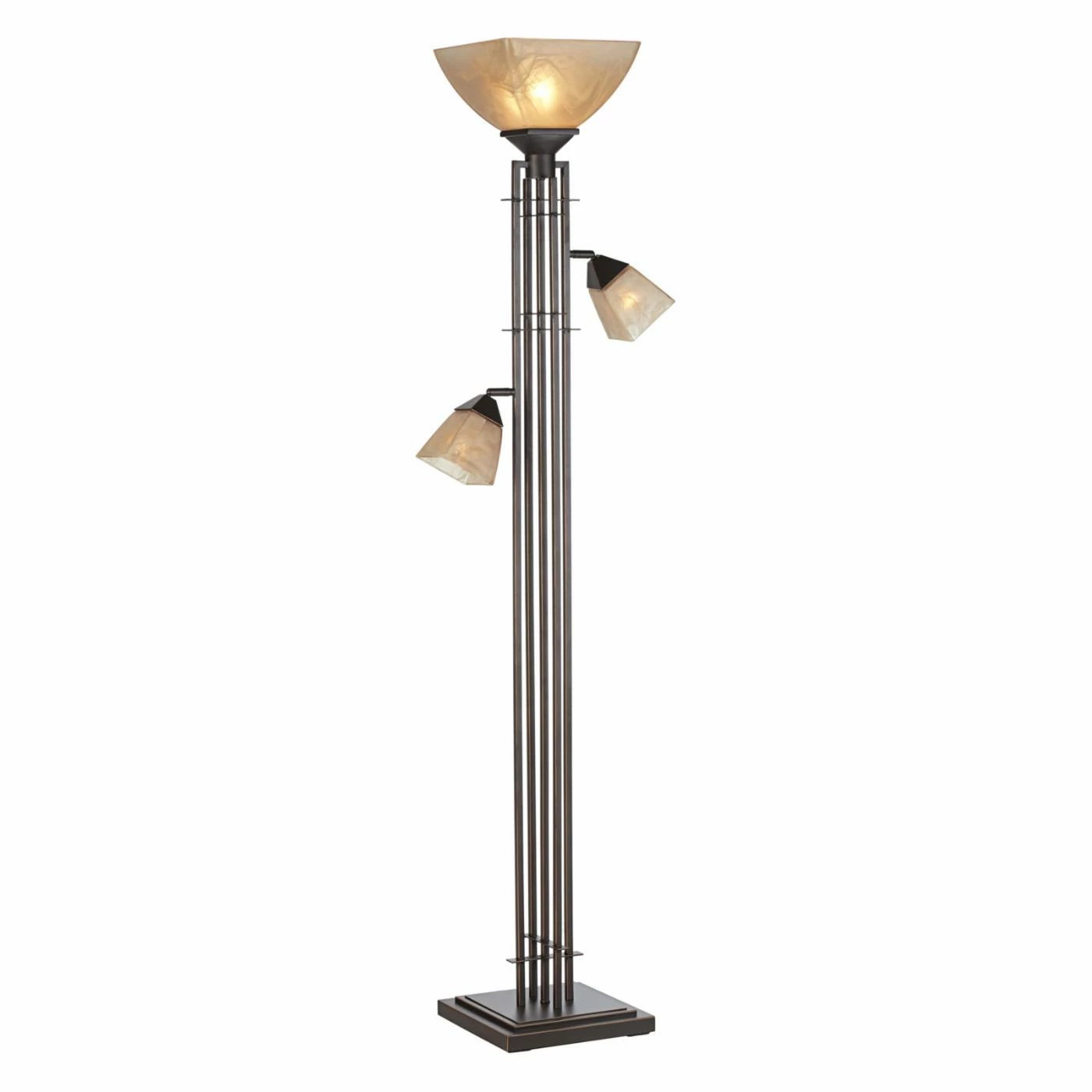 An urbane masterpiece, the Pacific Coast Lighting City Lines Torchiere Floor Lamp illuminates in style. This torchiere features three opulent glass shades on a sleek base. The base has a bronze finish with copper highlights. Bulbs not included.