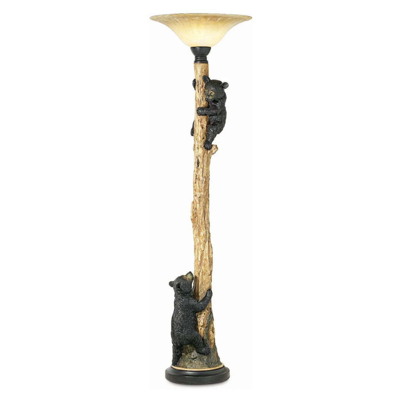 Black bear cubs climb the Pacific Coast Lighting Climbing Bears Torchiere Lamp and bring lodge-style charm home. The post of this floor lamp resembles a rustic wood pole. The flared glass bowl shade with speckled detailing adds elegance. This torchiere lamp requires one 150-watt 3-way incandescent bulb.