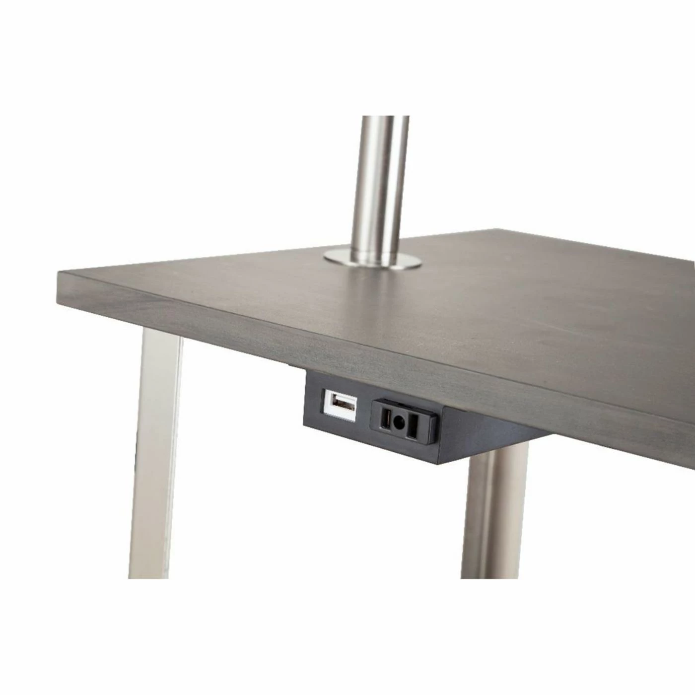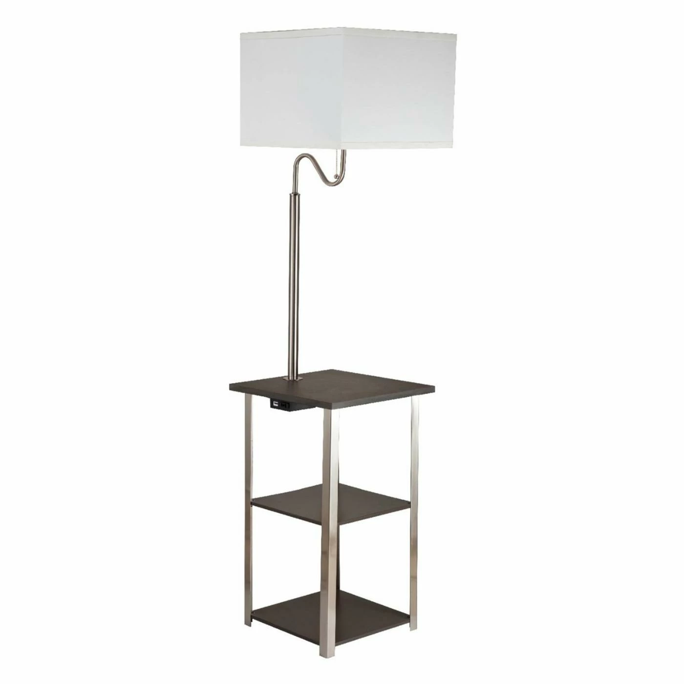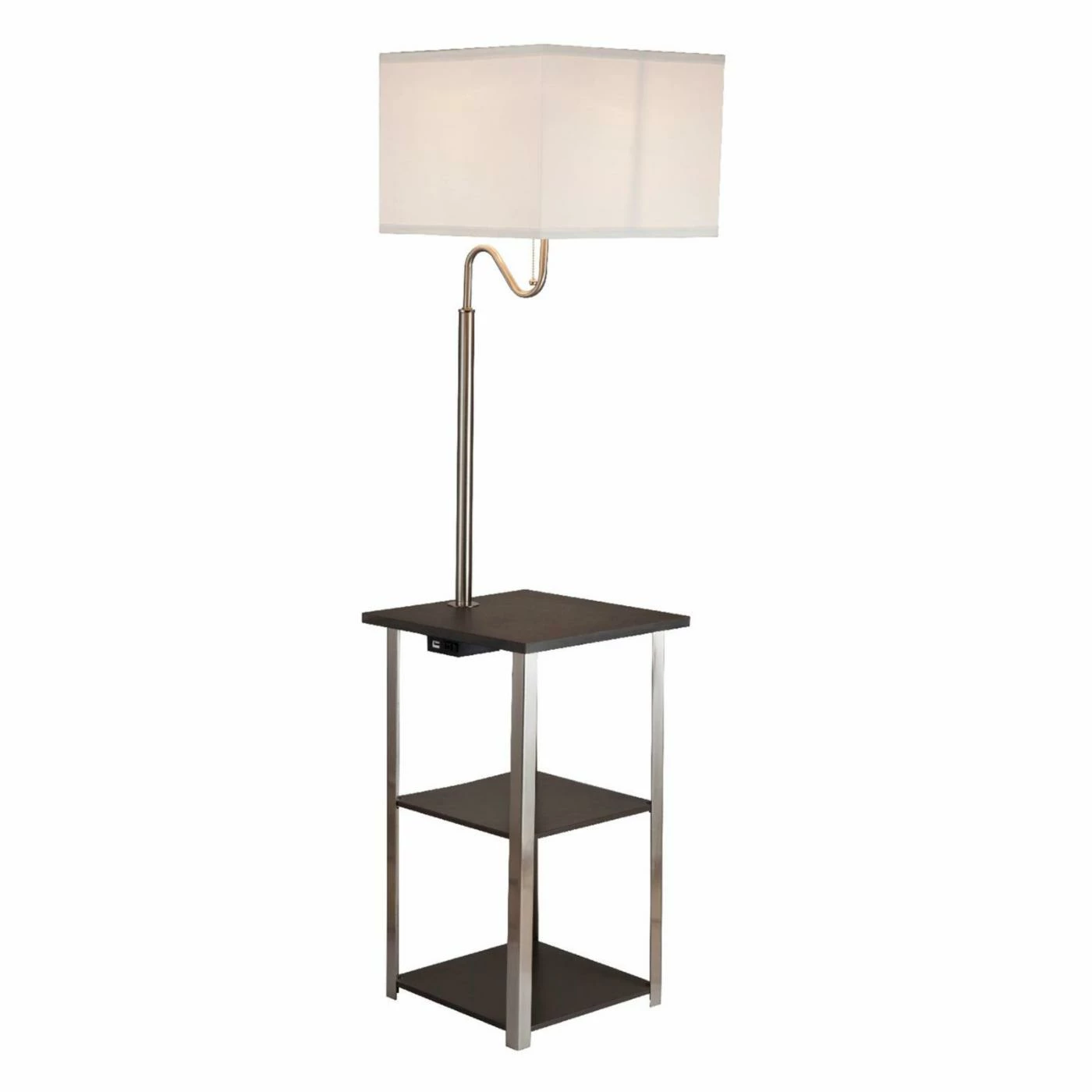 Get storage space and lighting in one compact design with the ORE International Dru 58 in. Square Side Table Floor Lamp and USB Station. Boasting two metal shelves and a top shelf crafted from engineered wood, youโll have more than enough space to store books, magazines, remotes, and more. Plus, this piece features a built-in outlet and USB port so you can easily charge your devices whenever needed. The silver finish on the metal frame beautifully complements the rich brown finish on the shelves to create a look that blends seamlessly with most color schemes. A square K/D cotton/linen shade in white allows this piece to blend seamlessly with most decors.