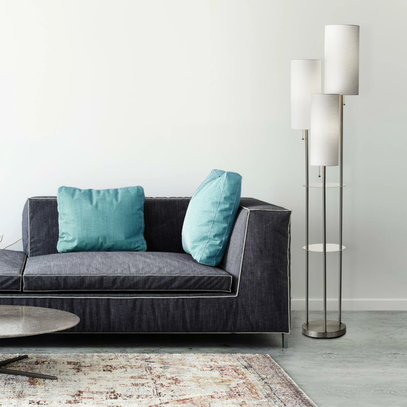 Three cylindrical white linen shades are graduated in height to give the Adesso Trio Floor Lamp its versatile light and contemporary appeal. Two clear acrylic shelves and slender satin steel poles add modernity to this floor lamp. It requires three 40-watt incandescent bulbs (not included).