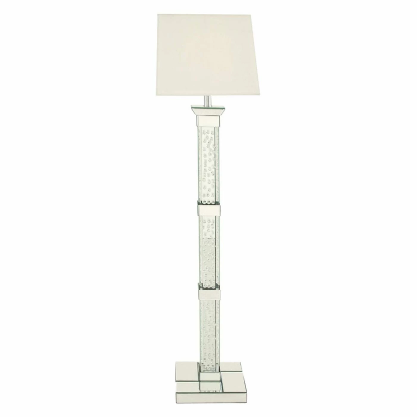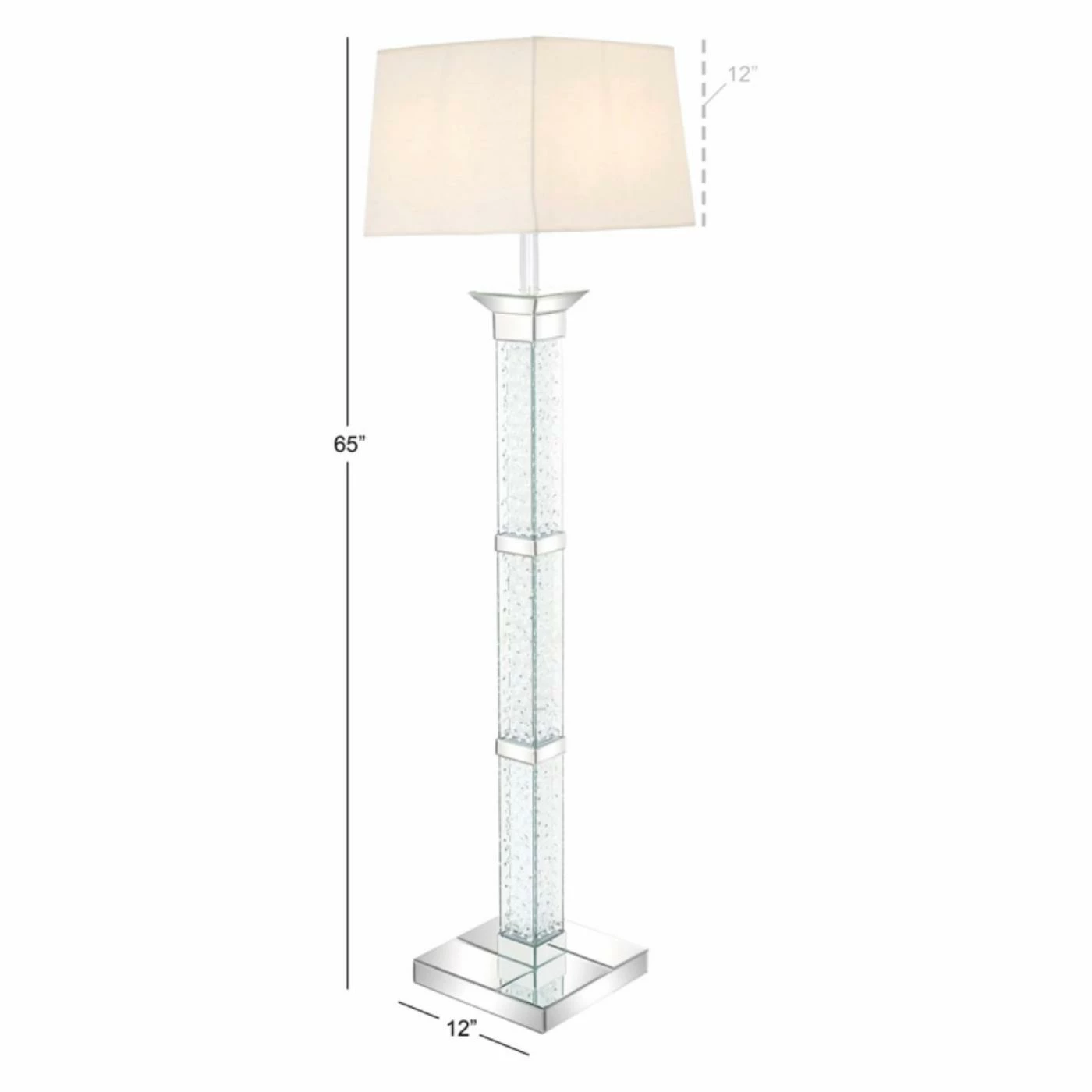 The DecMode 79290 Floor Lamp features a tiered tile base that stands out. Clean lines add a modern touch to this lamp. It includes a sturdy mirrored square base and a coordinating square shade.