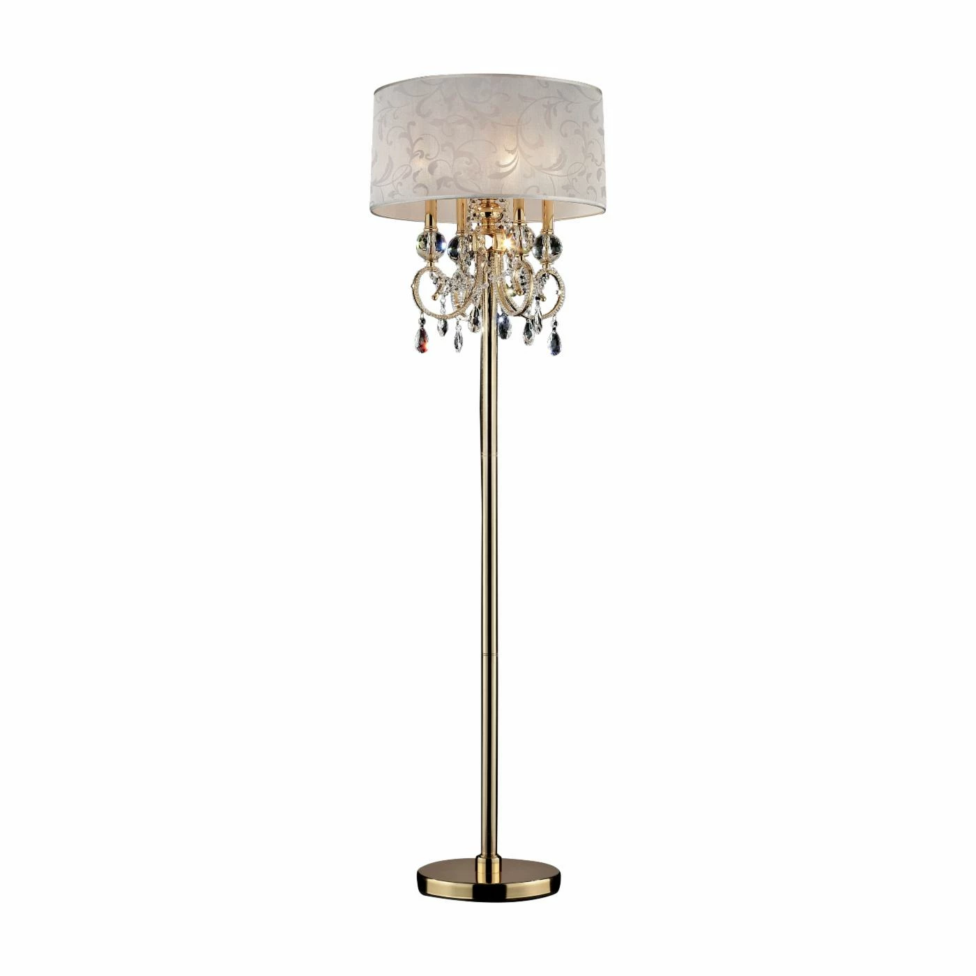 Elevate your space with the Furniture of America Janelle Floor Lamp. This striking gold floor lamp features a flourish of curled arms lined and dripping with teardrop crystals. The soft white drum shade is adorned with a light floral design for added sophistication and charm. A subtle foot switch makes it easy to turn on and off. Requires four 40-watt bulbs (included).