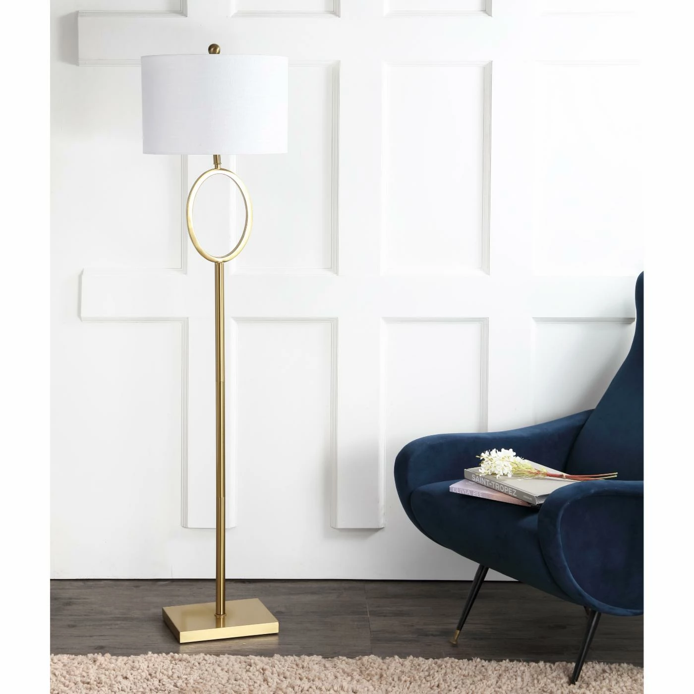 The slender brass-plated JONATHAN Y April LED Floor Lamp is punctuated with a dynamic hoop detail. For a crisp finishing touch, it features a white cotton drum shade, gleaming brass finial, and silk-wrapped cord you won’t want to hide, but easily can. This floor lamp requires one bulb and is compatible with any 12-watt LED, 100-watt type A, or 23-watt CFL. A nine-watt LED bulb is included.