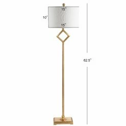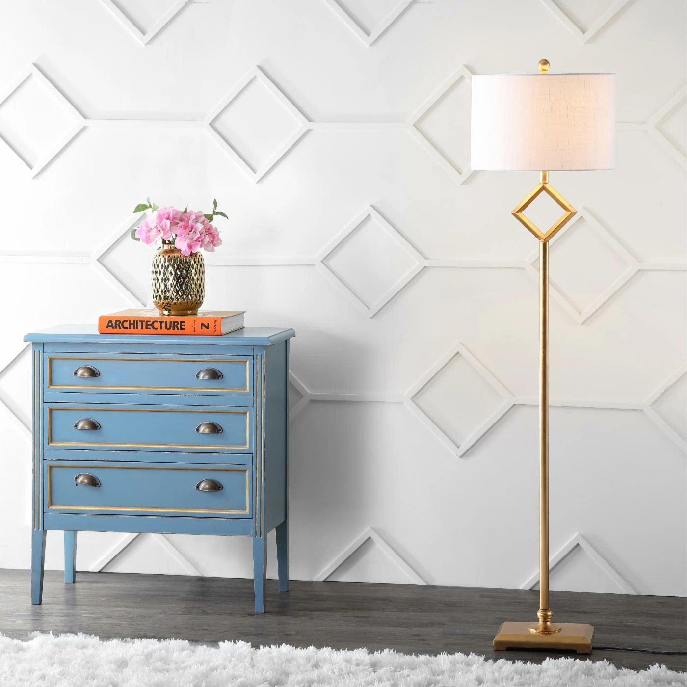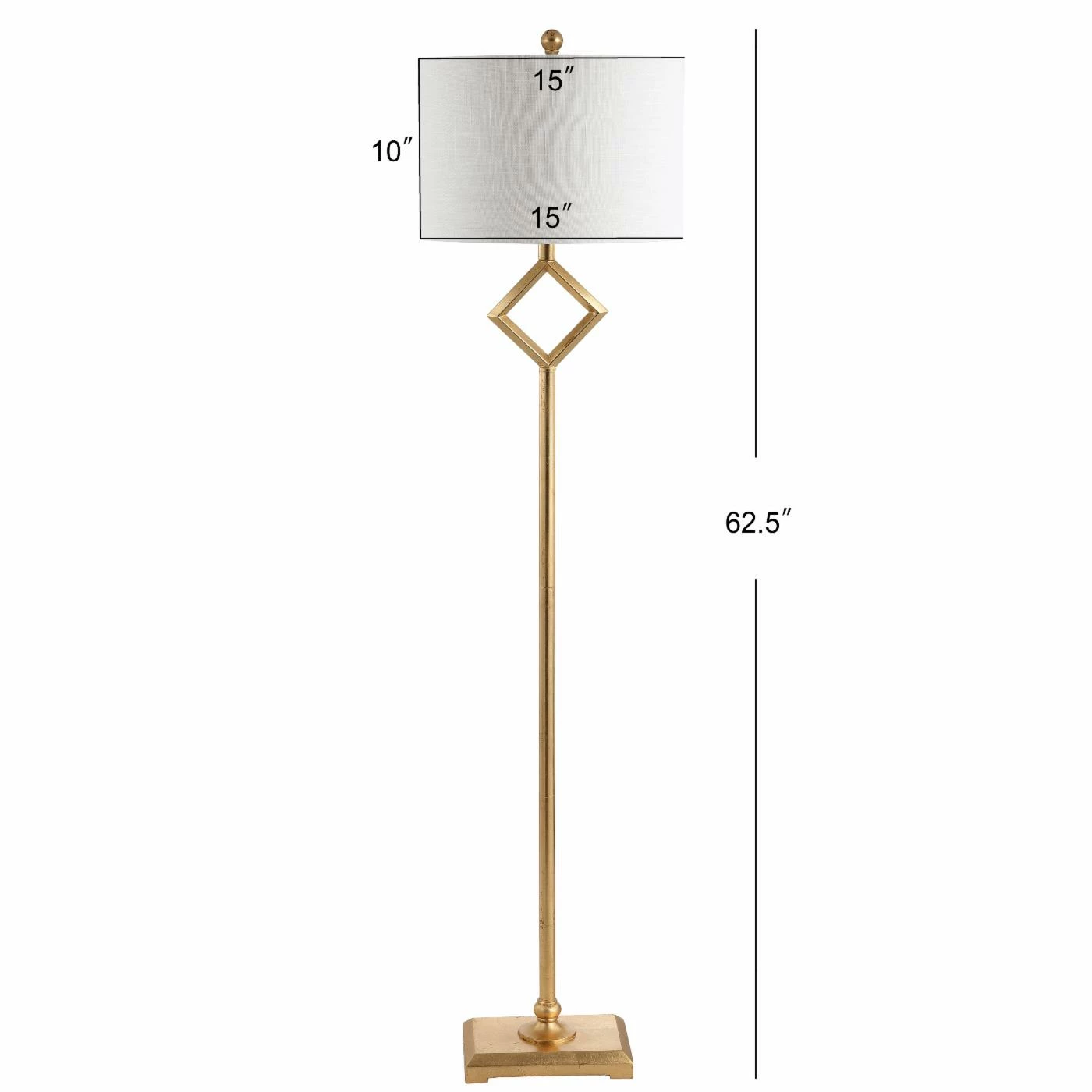 For added glamour, the JONATHAN Y Juno LED Floor Lamp is bathed in luxurious gold leaf. The slim, geometric base on this floor lamp is crowned simply by a white linen drum shade and ball finial. It requires one bulb and is compatible with any 12-watt LED, 100-watt incandescent, or 23-watt CFL. A nine-watt LED is included.