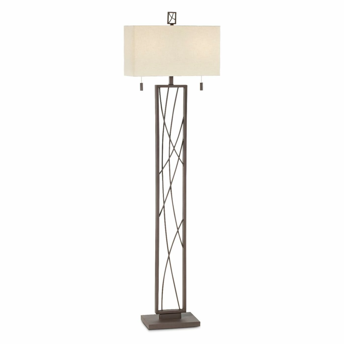 Brighten any room with the contemporary style of the Pacific Coast Lighting Crossroads Floor Lamp. The metal base is like a sculpture with strands of gently curving metal spanning from edge to edge of a tall rectangular frame. This lamp goes well with any decorating style. Use with two 60-watt bulbs (not included.)