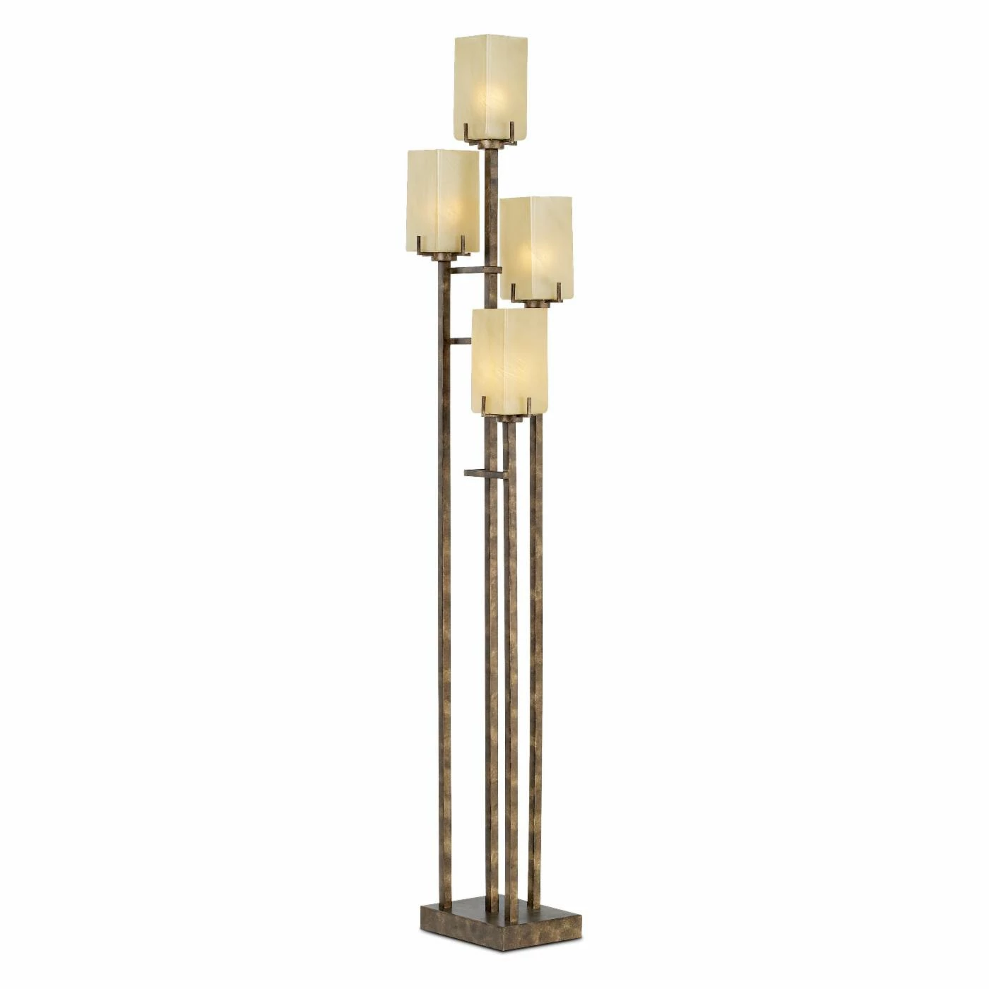 Four square cream glass shades are graduated to make the Pacific Coast Lighting Kathy Ireland Gallery City Heights Uplight Floor Lamp a dynamic way to illuminate your space. Sleek posts in a copper bronze finish with gold highlights rise up from the base to support the shades. This floor lamp requires four 75-watt incandescent bulbs.