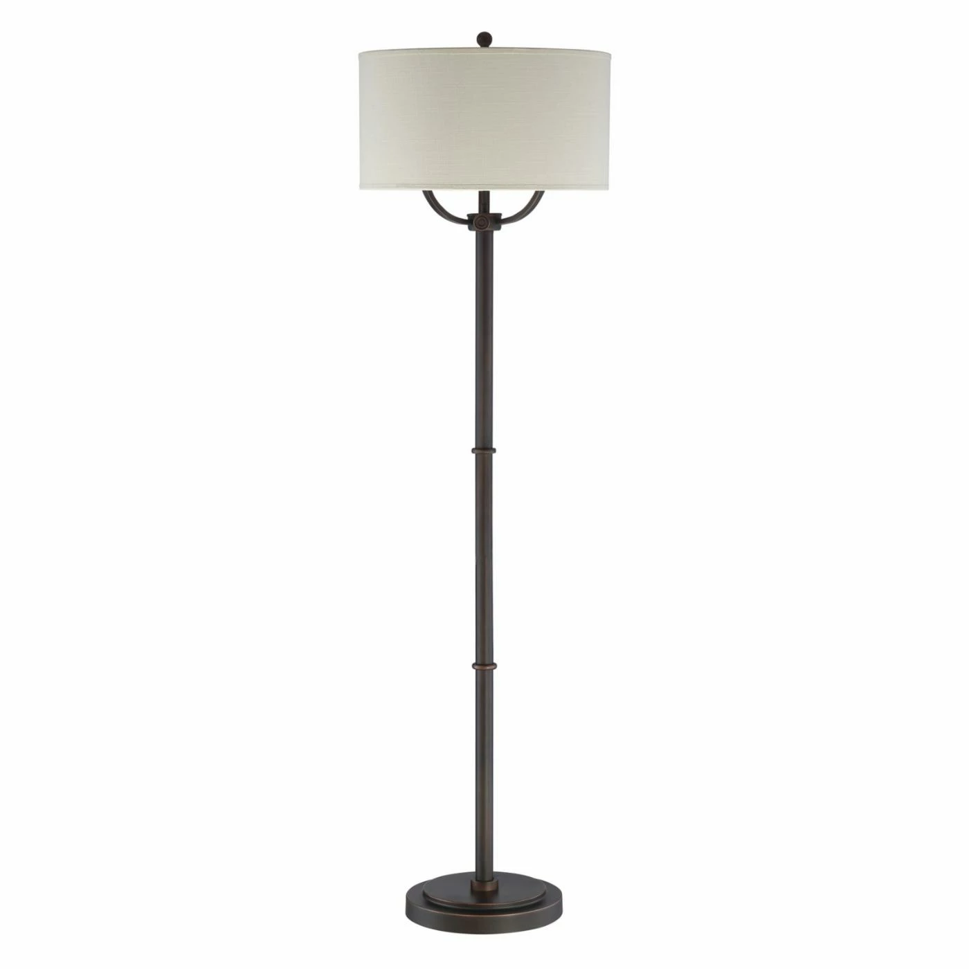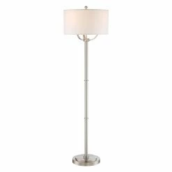 Brighten up a dark corner in a seating area, bedroom, or hallway in sleek style with the Quoizel Vivid Floor Lamp. The three lights included in the design are placed behind a beige fabric drum shade that softens their illumination for a pleasing, warm glow. Sold in your choice of available finishes, the lamp features a ball finial, a grooved post, and a simple stepped, round base.